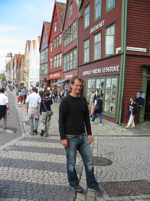 Þessir trékofar á bakvið voru byggðir af þýskum kaupmönnum á 14. öld (s.s. 13 hundruð og eitthvað) og þeir standa sumir enn ... þeir eru reyndar meira eða minna skakkir og skældir ... (fyrir söguáhugamann þá var Hansasambandið þarna frá 1360 til 1754)