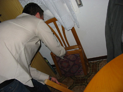 Ívar í góðum fíling og tínir upp leyfarnar af stólnum sínum ... (kannski að fíla Chilli Peppers aðeins of vel)