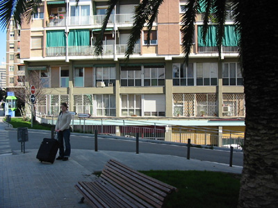 Nýja heimilið, íbúðin sést þó ekki, pálmatréð er fyrir, en hún er á jarðhæð.