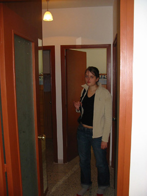 Gangurinn að herbergjunum, það rétt sést í dyrakarminn á okkar herbergi til vinstri, Finnarnir eru hægra megin.