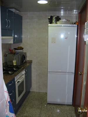 Eldhúsið, með örbylgjuofni, rafmagns bakaraofni með gashellum og ísskáp með sér frystihólfi (við fáum eina skúffu!).