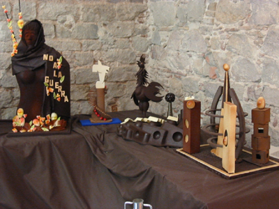 Súkkulaðistöngin er eftirmynd af listaverki sem var gert til heiðurs þeirra manna sem dóu fyrir frelsi og málstað Katalóníu 1713-1714. Á bakvið eru krakkar að spreyta sig á súkkulaðilistinni.