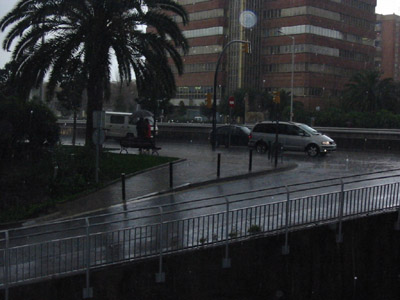 Það er ekki alltaf sól og sæla í Barcelona. Myndin nær ekki að koma því nógu vel til skila, en þetta er ein mesta rigning sem við höfum séð!